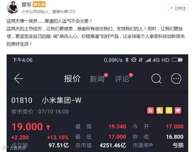 雷军在微头条发文表示:这两天像一场梦……厚道的人运气不会太差!这两天的上市经历,让我们更感恩,感谢所有信任我们、支持我们的人!同时,让我们更自信,更坚定走自己的路: 做"感动人心、价格厚道"的好产品,让全球每个人享受科技创新带来的美好生活!