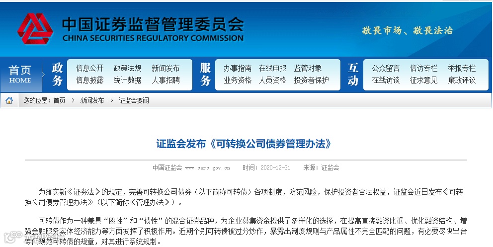 2020年12月31日,证监会发布了《可转换公司债券管理办法》(简称《管理办法》),针对个别可转债被过分炒作,制度规则与产品属性不完全匹配等问题进行系统规制。北京大学法学院副教授洪艳蓉在接受记者采访时表示,管理办法践行了“建制度、不干预、零容忍”的监管原则,突出了法治思维和对投资者权益的保护,尊重市场和各参与主体,有助于可转债市场的规范发展。