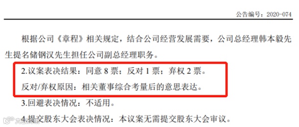 而此前韩本毅担任该公司总经理的议案也未全票通过,在8票同意之外,出现了1票弃权以及2票反对票,而该公司当天审议的其他议案均无反对票。
