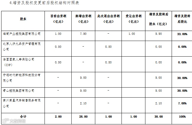 完成后,鸿商集团持股从50%将至33%,新股东宁德时代、青山控股均持股30%并列第二大股东,贵州贵星汽车销售持股7%。同时,随着原股东法国国家人寿和人济九鼎退出,中法人寿从中外合资险企变为中资险企。