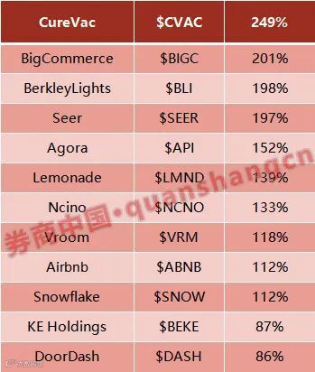 不过,在今年上市的约200家公司中,80%尚未盈利。彭博数据显示,它们的股价在第一个交易日平均上涨了27%。下图为,今年以来上涨最好的新股首日表现。