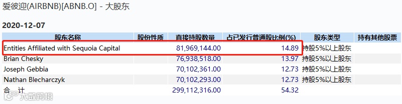 目前持股份额第一的机构是红杉资本,也是公司IPO的最大赢家。在Airbnb上,红杉资本的总投资额为2.6亿美元,占发行前A类股16.6%,发行后占股比例为14.89%,红杉资本的股权价值接近128亿美元,投资回报率达到48倍,令人惊叹!