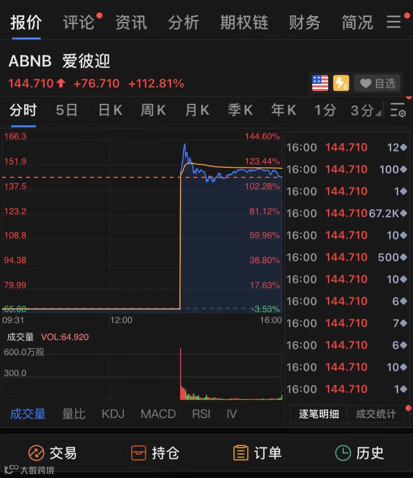 北京时间昨夜,美国民宿巨头Airbnb(中文名称:爱彼迎)首日上市,暴涨超112%,市值超864亿美元(5653亿人民币)。此前一天,“美版美团”DoorDash上市,大涨85.53%。