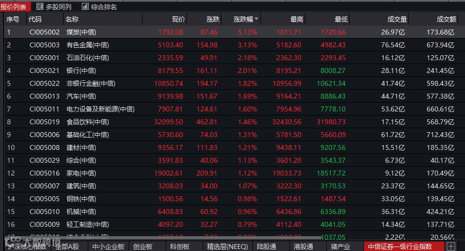 盘面上看,煤炭、有色等资源板块成为领涨主力,随后券商等金融跟进共同推动沪指走高。Wind数据显示,中信证券一级行业指数中,煤炭指数单日大涨5.13%,领涨市场。有色金属和石油石化指数分别以3.13%和2.18%的涨幅位列二、三。银行和非银金融板块也都整体大涨。
