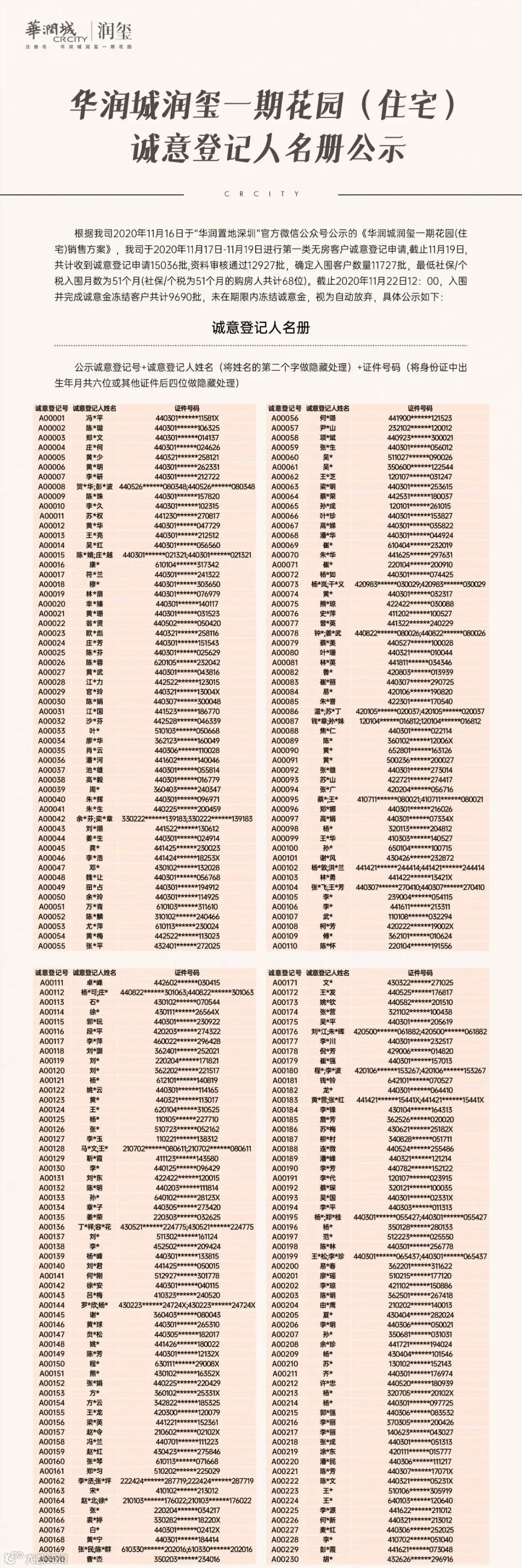 根据华润置地深圳官方微信公众号今天发布的消息,华润城润玺一期花园(住宅)对诚意登记人名册公示。