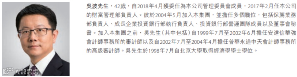 公开信息显示,吴波出生于1977年,现年只有43岁,是中金公司最为年轻的高管之一。在加入中金公司之前,吴波曾在安达信华强、普华永道中天等多家会计师事务所担任审计师,具有丰富的财务背景,2004年5月,吴波加入中金公司投资银行部,此后曾担任多个业务部门负责人,并在2015年-2018年担任中金董秘。