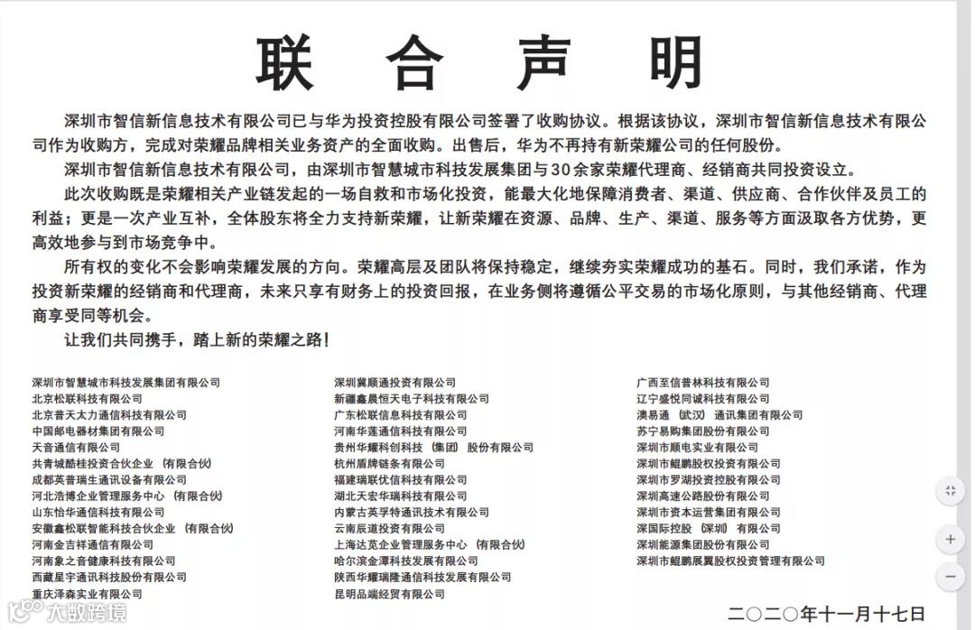 11月17日,深圳特区报刊登联合声明,披露荣耀被出售的消息。声明显示,深圳市智信新信息技术有限公司已与华为投资控股有限公司签署了收购协议。根据该协议,深圳市智信新信息技术有限公司作为收购方,完成对荣耀品牌相关业务资产的全面收购。出售后,华为不再持有新荣耀公司的任何股份。