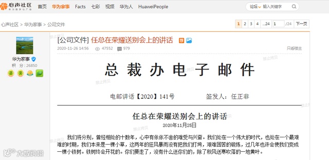 11月26日,华为内部网站心声社区发布任正非在荣耀送别会上的讲话,引得业内一片唏嘘和感慨。