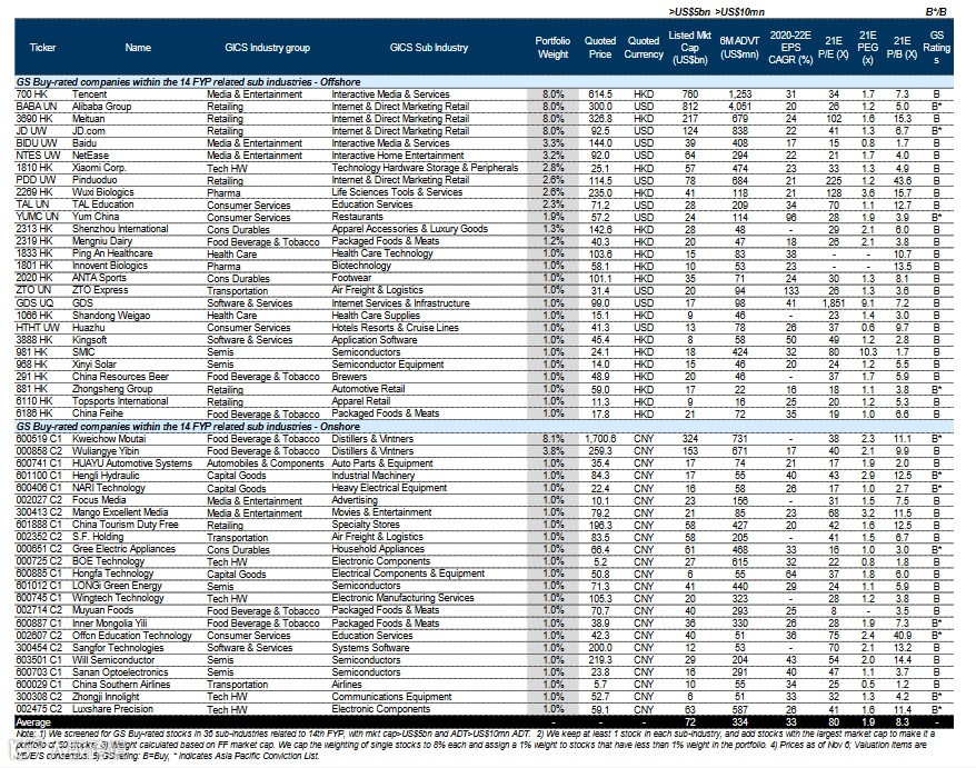 基于中国企业的盈利增长空间、股票估值情况以及人民币升值预判等多重因素,高盛中国首席股票策略师刘劲津认为,2021年港股和A股的回报预测均在16%左右,建议高配耐用消费品、媒体、医药、交通运输、零售等。刘劲津还提到,未来几年内,围绕十四五规划重点布局的行业均是股市内重要的投资主题,数字化趋势、自主化、内需等三个主题可予以特别关注。