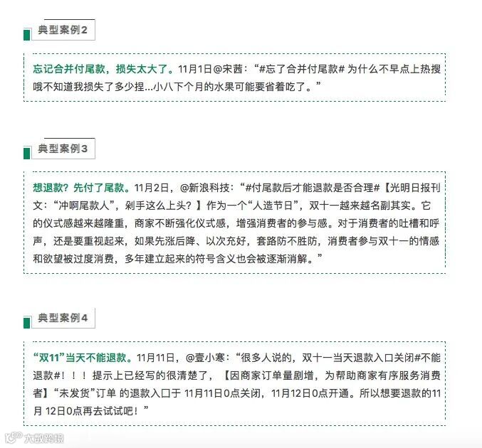 二是不合并付尾款不能使用满减优惠券、不付尾款不能退款、付尾款必须熬到凌晨、双11当天不能退款等“硬规则”引发的无奈“吐槽”热度持续时间较长。