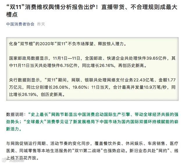 基于对10月20日—11月15日期间相关消费维权情况的网络大数据舆情分析,中国消费者协会微信公众号近日发布《“双11”消费维权舆情分析报告》(以下简称“《报告》”)。