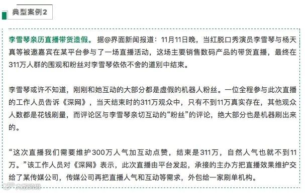 据腾讯《深网》报道,“一位全程参与此次直播的工作人员告诉《深网》,当天结束时311万的观众中,只有不到11万真实存在,其他观众人数都是花钱刷量,而评论区与李雪琴亲切互动的“粉丝”的评论,绝大部分也是机器刷出来的。”