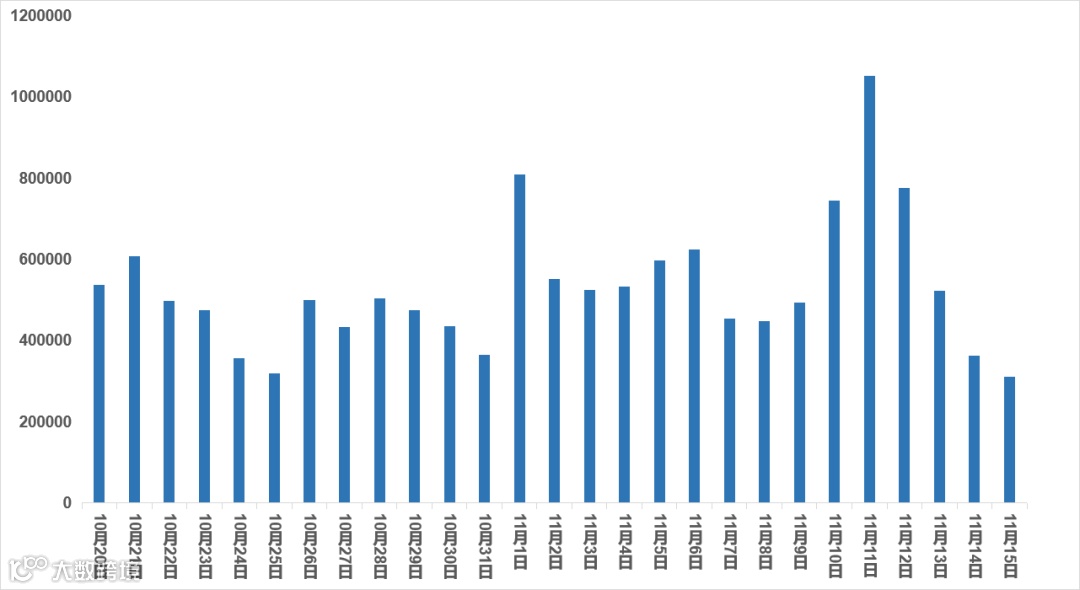 据中国消费者协会,在10月20日至11月15日共计27天监测期内,系统共收集“双11”相关“消费维权”类信息14296274条,日均信息量约53万条。监测期间,“消费维权”信息曲线呈波动走势,并在10月21日、11月1日和11日出现三个舆情声量高点,高点出现与多家头部电商平台的开幕“狂欢”和两波促销密切相关。其中,峰值出现在11月11日,为1051437条。
