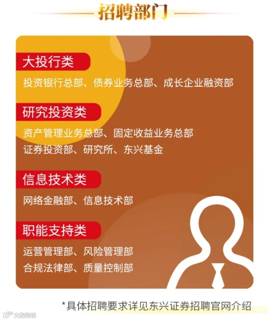 类似地,东兴证券也在11月9日启动2021年校园招聘,招聘口号为“百川归海兴好有你”。此次东兴证券共放出28个校招岗位,覆盖大投行、研究投资、信息技术等多个部门以及东兴基金等子公司。在招聘流程上,在网申后12月进行笔面试,2021年1月进行实习考察,此后发放录用通知。