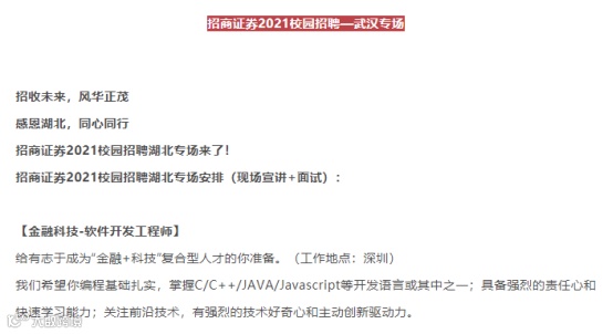 线上开辟招聘专场,也有券商在线下做足功课。例如,近期招商证券即在湖北武汉安排专场校园招聘,重点招聘金融科技——软件开发工程师岗位。此前,招商证券还曾推出过金融科技精英训练营等暑期校园项目,在金融科技人才招聘中“先下手为强。”