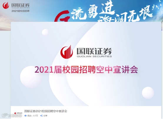 例如,国联证券即在10月底发布了2021年校园招聘空中宣讲会视频,在长达近40分钟的视频中,国联证券详细介绍了公司发展、历史沿革以及各个部门情况,并有多名员工出镜介绍相关岗位情况等。其中,人力资源相关负责人还对国联证券的薪酬福利、管理体系、培养计划等内容进行全面介绍。目前,该视频的观看用户已达到5.7万。