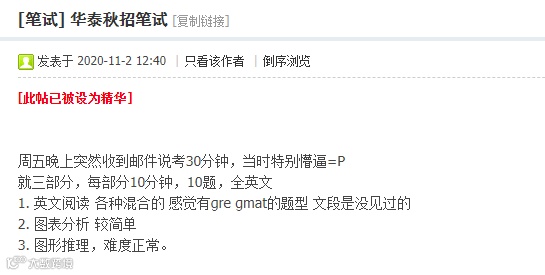 对于应届生求职来说,行测和性格测试属于笔面试环节的敲门砖。在秋招笔试之时,华泰证券采用的全英文“认知能力”笔试,引起了不少学子的热议。有应届生表示,华泰证券全英文笔试共计30分钟,分别为阅读理解、数学统计和图形推理,“基本是英文版的选择题,没考CFA,也没考基本证券常识”。
