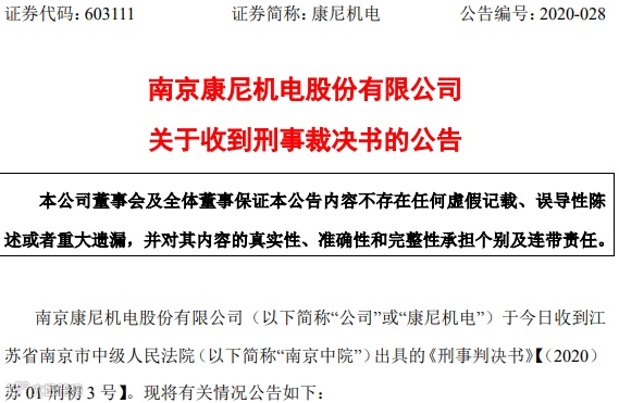 11月27日,康尼机电发布公告称收到南京中院出具的《刑事判决书》,龙昕科技原法定代表人廖良茂犯合同诈骗罪,被判处无期徒刑,剥夺政治权利终身,并没收个人全部财产。同时廖良茂还被责令将犯罪所得约19.33亿元退还给被害单位康尼机电。