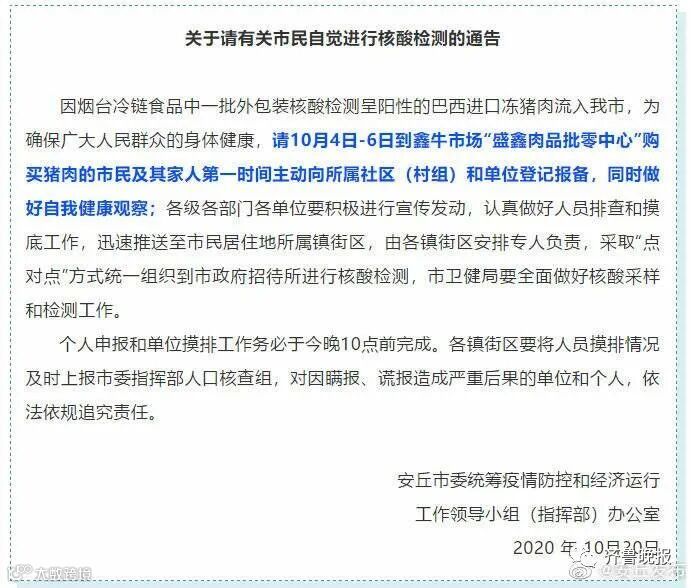 因烟台冷链食品中一批外包装核酸检测呈阳性的巴西进口冻猪肉流入安丘市,为确保广大人民群众的身体健康,请10月4日-6日到鑫牛市场“盛鑫肉品批零中心”购买猪肉的市民及其家人第一时间主动向所属社区(村组)和单位登记报备,同时做好自我健康观察;各级各部门各单位要积极进行宣传发动,认真做好人员排查和摸底工作,迅速推送至市民居住地所属镇街区,由各镇街区安排专人负责,采取“点对点”方式统一组织到市政府招待所进行核酸检测,市卫健局要全面做好核酸采样和检测工作。