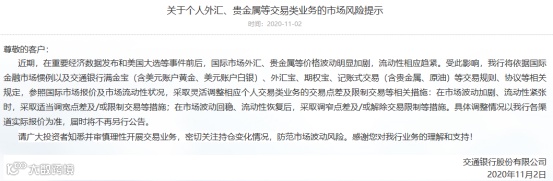 同日,交通银行也在官网发布《关于个人外汇、贵金属等交易类业务的市场风险提示》的公告:近期,在重要经济数据发布和美国大选等事件前后,国际市场外汇、贵金属等价格波动明显加剧,流动性相应趋紧。
