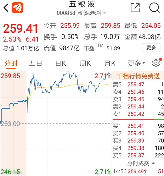 当天上午,五粮液盘中涨幅快速冲破2%,市值首次突破万亿创下新高。在五粮液带动下,酒鬼酒、老白干酒等一众白酒概念股集体拉升,白酒板块半日飙升超2100亿。与此同时,宁德时代、比亚迪、长城汽车等一众千亿市值超级大白马集体暴动,引发一波资金追捧。