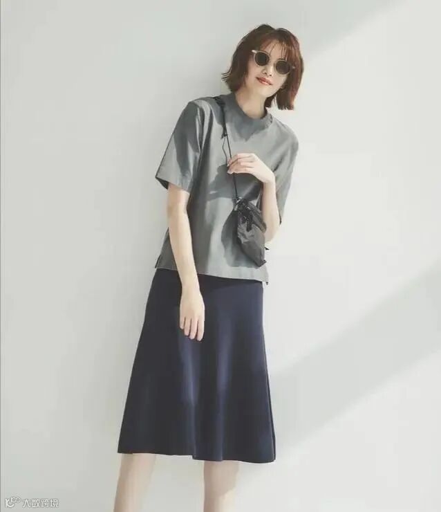 好比这件灰色T恤,它是最简单的一种设计,外表之中不增添任何的元素,也能让它拥有一番大气的美感。匹配的是简单的裙装,适合对自己身材不够满意的女性尝试。通过服装搭配,将身材方面的一些瑕疵进行自然的隐藏。