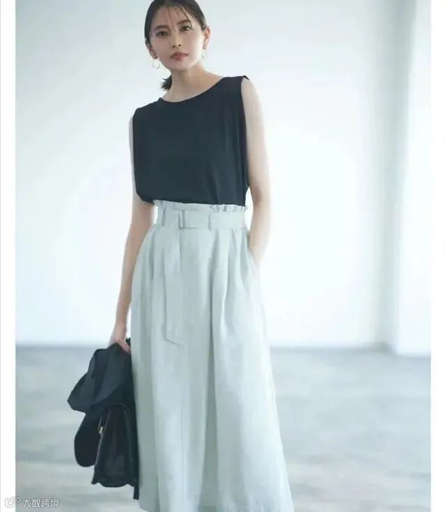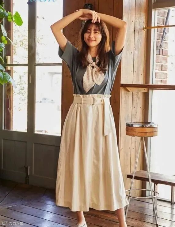而不管选择哪一种基础颜色的T恤,都可以搭配色系简单的高腰过膝裙。像这款裙装单品,它能够让造型拥有优雅的氛围。而裙装对腰部线条的重点勾画作用,将会导致女性的比例折射更加清晰。