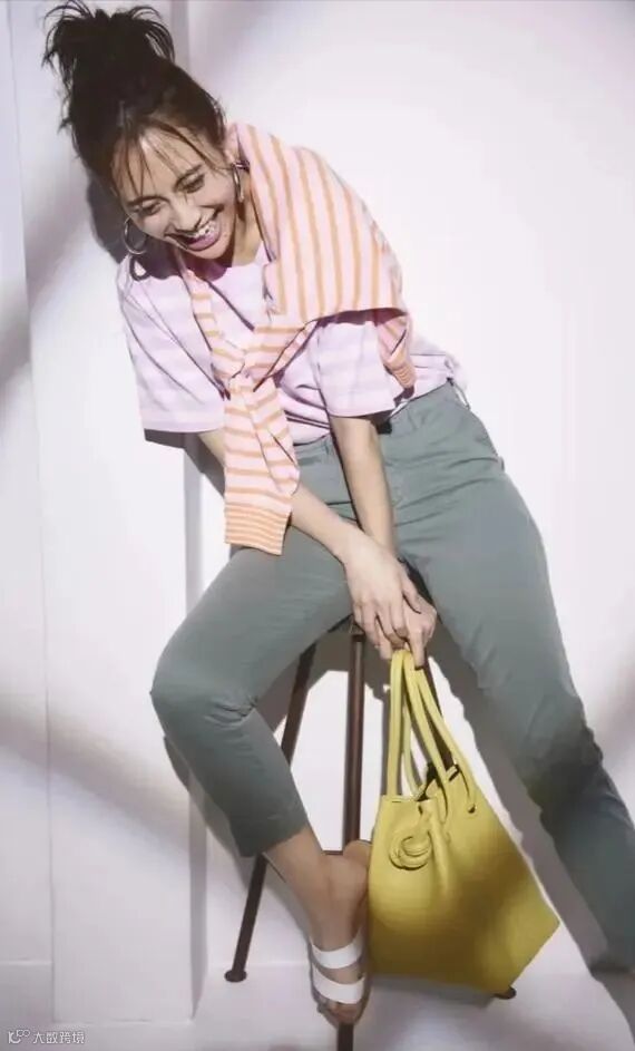 衣柜里不能全都是那些颜色大众的T恤,也可以采取一些彩色T恤,增加视觉魅力。例如这款粉白衔接的条纹T恤,它就能冲淡T恤本身的无趣感,打造出甜美的、减龄的氛围。结合的裤装可宽可紧,跟女性的身材特点挂钩。