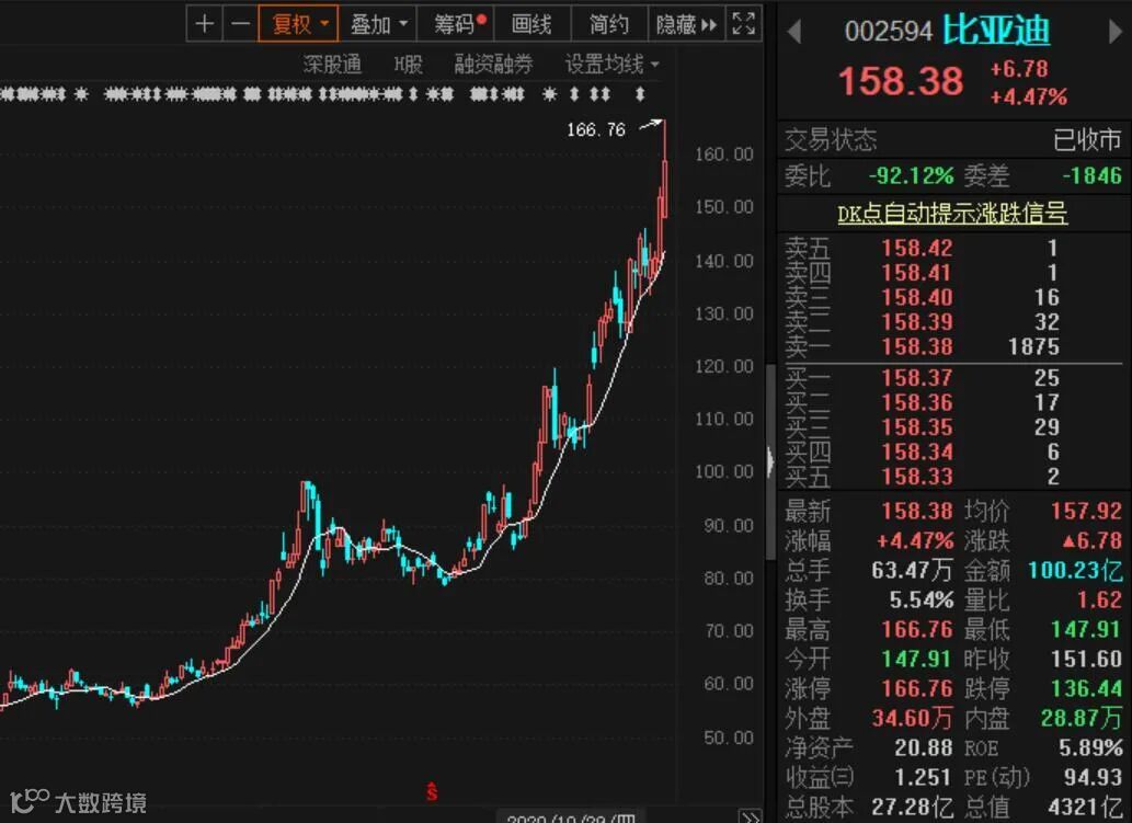 股价方面,比亚迪8月底股价在80多元附近,昨日最高飙涨到166.76元,两个月股价就翻倍。市值也从2000多亿元涨到如今的4321亿元。