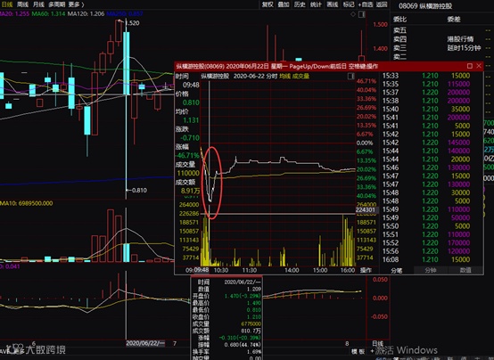 记者查阅港股纵横游控股行情走势图发现,纵横游控股平时波动极小,且成交相当稀少,2020年6月之前的一段时间单日成交甚至不足10万港元,但是自6月中旬开始,成交量开始明显放大,股价也有一定上涨。但6月22日当天开盘后不久,股价短时间内出现闪崩,盘中跌幅一度接近50%,截至当天收盘,股价仍下跌20.39%,之前几个交易日追高的投资者在这一天损失惨重。