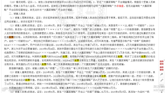 上述判决书中,根据被害人胡某1的陈述,证实2019年6月,其在“大赢家策略”平台上“炒股”被骗10万元。其微信号×××22,昵称“一切都好”。2019年5月初,其添加一位介绍炒股的微信号“lwwygtr7788”,昵称为“杨雪”的人的微信。后被“杨雪”拉入一个炒股微信群,微信群里会有人发炒股导师的微信名片,让微信群里的人添加。其前后总共添加了6个微信号,这些微信号经常发一些关于炒股的资料,称可以通过私募的方式来拉高股票的价格,从而获取利润。