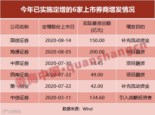据券商中国记者统计,今年以来,已有中信证券、第一创业证券、西南证券、中原证券、海通证券和国信证券6家券商实施了定向增发,共计募集资金约612亿元,用于补充流动资金、项目融资和引入战投等。其中,三家券商募资超百亿:海通证券募资200亿元,国信证券募资150亿元,中信证券募资134.6亿元。