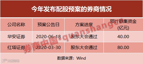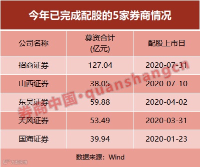 配股方面,今年已有招商证券、山西证券、东吴证券、天风证券和国海证券5家券商完成配股,募资共约318亿元。华安证券和红塔证券的配股方案已经获股东大会通过,两家券商预计分别募资40亿元和80亿元。
