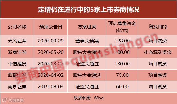 此外,南京证券、西部证券、中信建投、浙商证券和天风证券5家券商的定增仍在进行中,预计募资共达493亿元。南京证券和中信建投的定增方案已获证监会通过,中信建投、浙商证券和天风证券预计募资金额均超百亿。