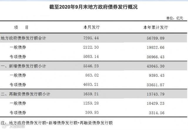 近日,财政部政府债务研究和评估中心公布了2020年9月地方政府债券发行情况。最新数据显示,9月全国发行地方政府债券7205亿元。其中,新增债券5546亿元,包括新增一般债券863亿元,新增专项债券4683亿元。再融资债券1659亿元,包括一般债券1259亿元,专项债券400亿元。