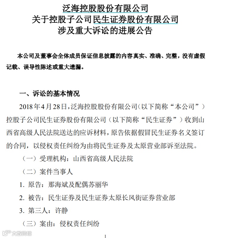 泛海控股发布的公告显示,2018年4月28日,泛海控股子公司民生证券收到山西省高级人民法院送达的应诉材料,自然人那海斌及配偶苏丽华依据假冒民生证券名义签订的合同,以侵权责任纠纷为由将民生证券及太原营业部诉至法院。