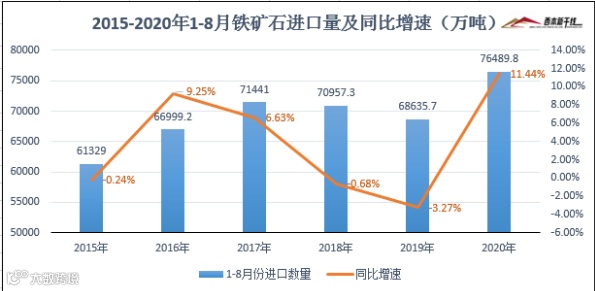 铁矿石方面,据海关总署数测算,2020年8月我国进口铁矿砂及其精矿1亿吨,同比增长5.81%,8月份,钢协发布的进口铁矿石平均价格达到119.93美元/吨;1-8月我国累计进口铁矿砂及其精矿7.59亿吨,同比增长11.44%,累计进口金额为706亿美元,累计平均进 口单价为92.9美元/吨。