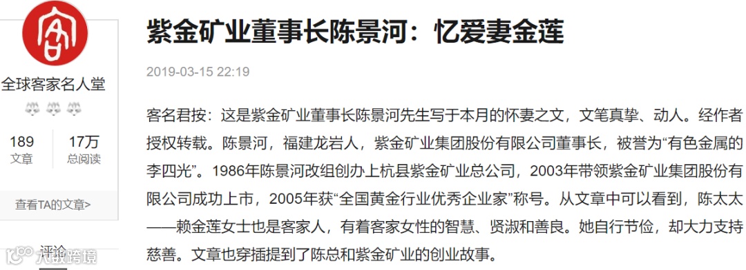 据了解,陈景河发妻赖金莲已因病去世,陈景河去年专门发文悼念发妻。根据公众号“全球客家名人堂”授权转载的文章《紫金矿业董事长陈景河:忆爱妻金莲 》,陈景河与赖金莲是高中同班同学,大学毕业后两人结婚,2019年1月赖金莲因病去世。