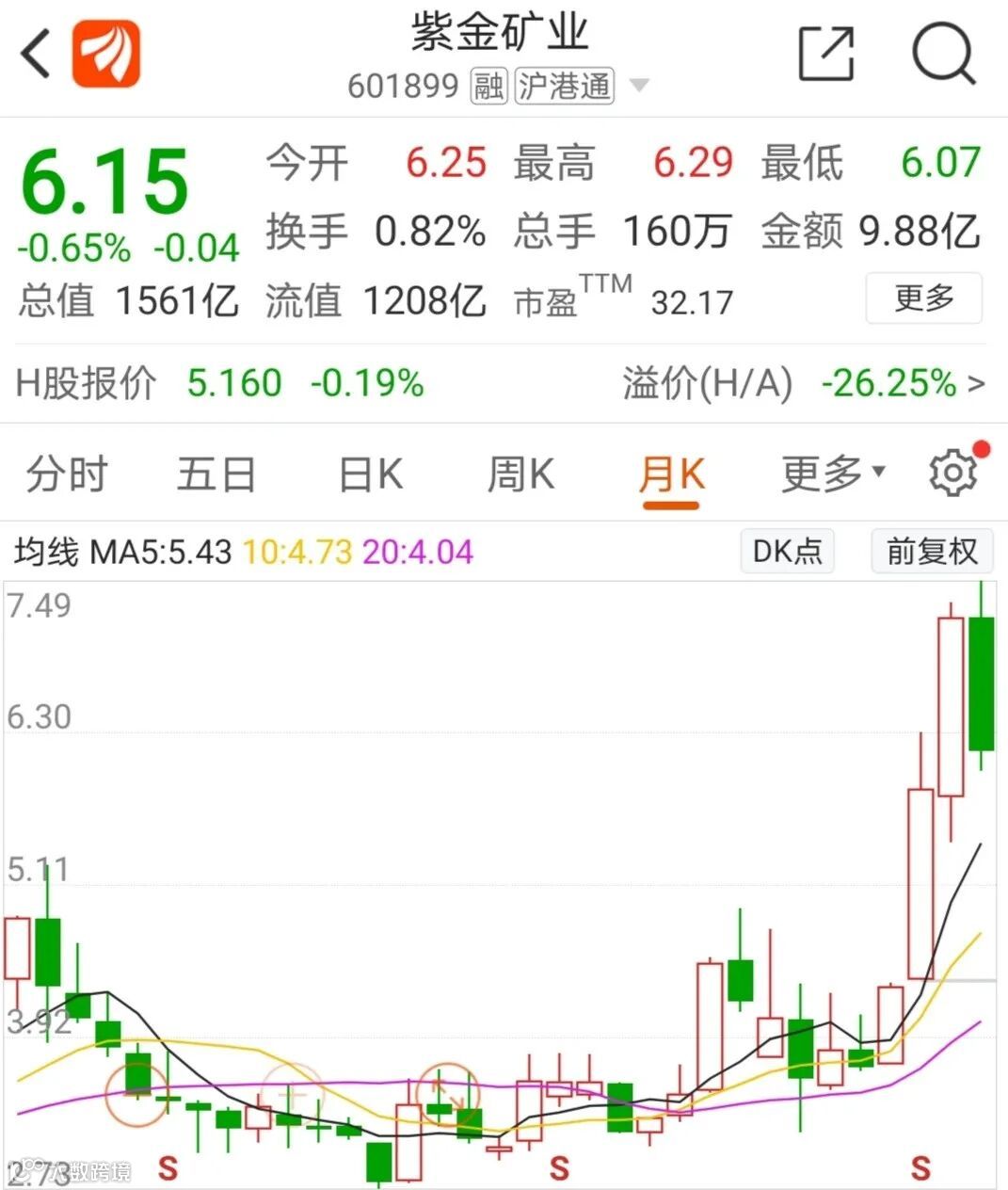 Wind数据显示,当前紫金矿业总股本为254亿股,A股最新股价为6.15元,港股股价最新股价为5.16港元。目前,紫金矿业总市值约达1500亿元。