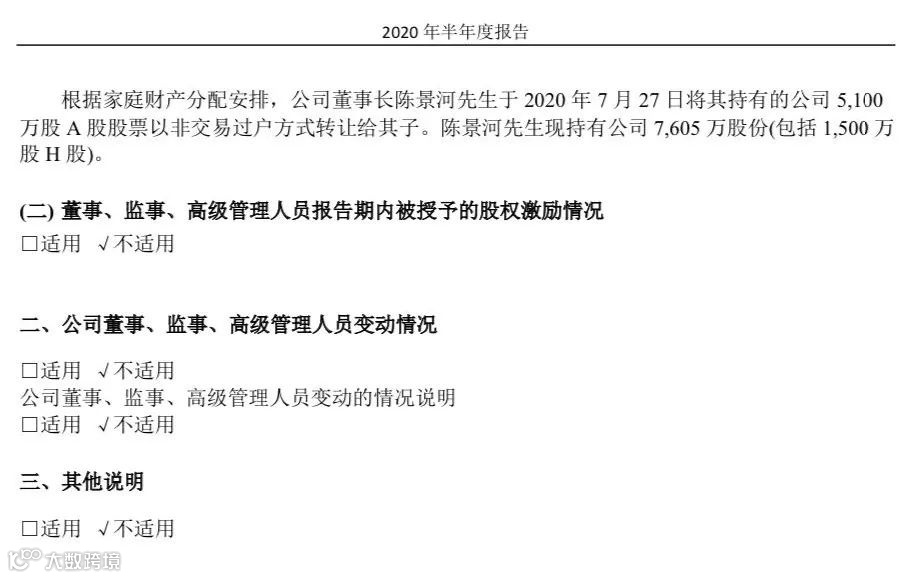 根据紫金矿业2020年半年报,在2020年7月27日,陈景河因为家庭财产分配安排,将持有的公司5100万股A股股票以非交易过户方式转让给其子。