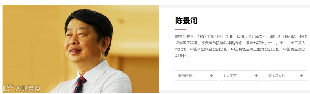 陈景河有“有色金属的李四光”的业内称誉。公开资料显示,他毕业于福州大学地质专业、厦门大学EMBA,教授级高级工程师,享受国务院特殊津贴专家。陈景河是紫金矿业的创始人和核心领导人,紫金山金铜矿的主要发现者、研究者和开发组织者,自2000年起一直担任公司董事长(其中2006年8月至2009年11月兼任公司总裁)。