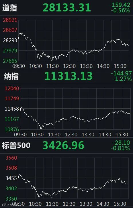 截至收盘,道指跌0.56%报28133.31点,标普500指数跌0.81%报3426.96点,纳指跌1.27%报11313.13点。本周,道指跌1.82%,纳指跌3.27%,标普500指数跌2.31%。纳指和标普500指数结束五周连涨走势。