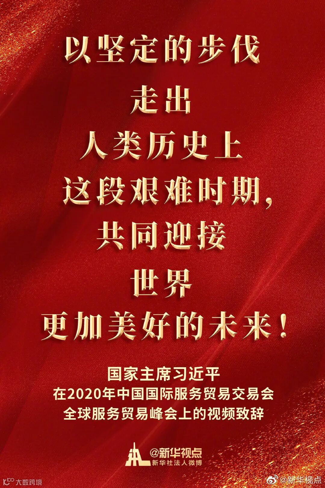 习近平最后强调,突如其来的新冠肺炎疫情,在一段时间内阻隔了我们的相聚,但阻挡不了服务贸易发展的脚步,阻断不了我们携手共进、合作共赢的信心和行动!让我们齐心协力、携手前行,以坚定的步伐走出人类历史上这段艰难时期,共同迎接世界更加美好的未来!