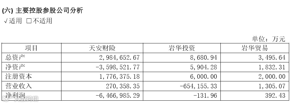 从西水股份主要控股参股子公司情况来看,上半年天安财险净亏损达到646.7亿元,净资产为-359.85亿元。可以说,天安财险已经处于严重资不抵债状态。