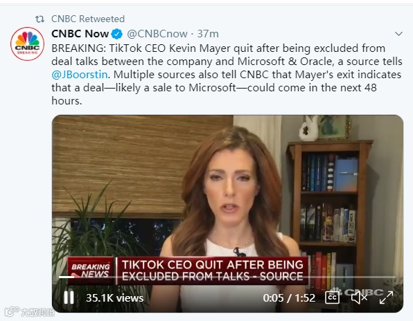 据CNBC,知情人士说,TikTok即将达成出售其美国业务的协议,并可能在未来几天宣布一项交易。TikTok首席执行官凯文·梅耶尔(Kevin Mayer)周四宣布辞职。此前该消息泄露给了《金融时报》。一位不愿透露姓名的人说,梅耶尔原本打算宣布下周与出售协议一起退出的决定,但他加快了处理这一事务的时间。梅耶(Mayer)在运行迪士尼的流媒体视频业务后,于今年初加入了TikTok。TIKTOK公司在给员工的内部备忘录中说,TikTok美国业务负责人Vanessa Pappas将在Mayer离开后经营TikTok。