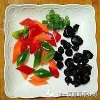 3. 木耳泡发,胡萝卜,青红椒切菱形片备用。