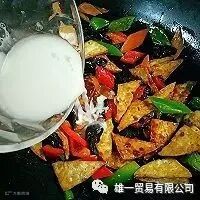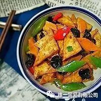 10. 倒进煎好的豆腐角,加入两勺黄豆酱,翻炒均匀。