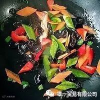 9. 放进木耳,胡萝卜和青红椒中火翻炒至木耳噼啪作响,胡萝卜变软。
