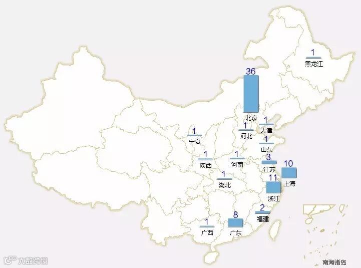 79家影视企业分布在全国15个省份/直辖市中,其中北京最多,有36家,占比45.57%,其后是浙江11家、上海10家、广东8家。可见北京和长三角地区是新三板影视公司的主要聚集地。