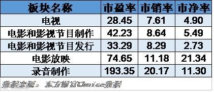 新三板影视行业分领域看,电视行业估值最低,28.45倍PE,其次是影视发行、影视制作、电影放映,录音制作最高,为193.35倍PE。